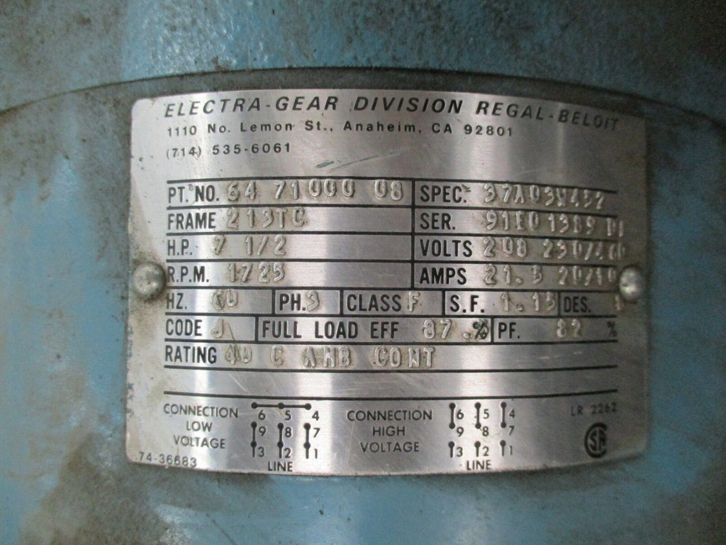 Regal Electra-Gear Motor 64 71000 08 7.5HP 1800RPM FR: 213TC 208-230/460V Used