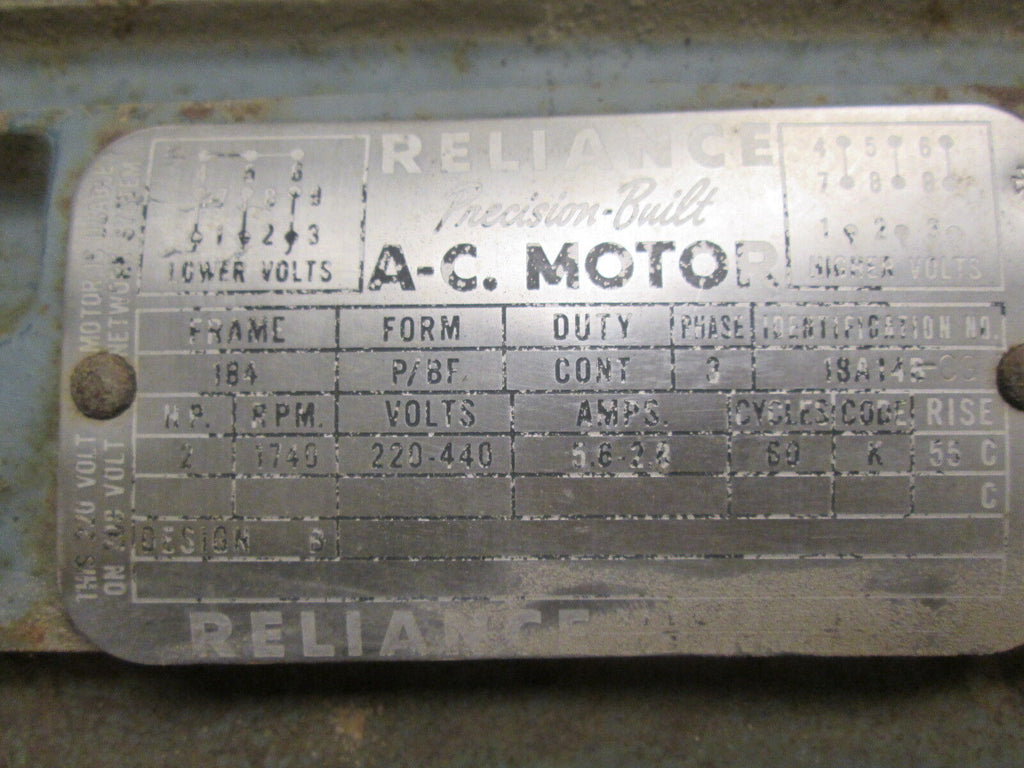 Reliance AC Motor 18A14B-CG 2HP 1800RPM FR:184 220-440V 5.6-2.8A Used_x000D_ Condition: UsedBrand: Reliance ElectricMPN: 18A14B-CG Reliance AC Motor 18A14B-CG 2HP 1800RPM FR:184 220-440V 5.6-2.8A Used Reliance AC Motor Part #: 18A14B-CG 2HP 1740RPM Frame: 184 220-440V 5.6-2.8A UsedLOC AB9E3-9 Reliance AC Motor Part #: 18A14B-CG 2HP 1740RPM Frame: 184 220-440V 5.6-2.8A Uséd LOC AB9E3-9
