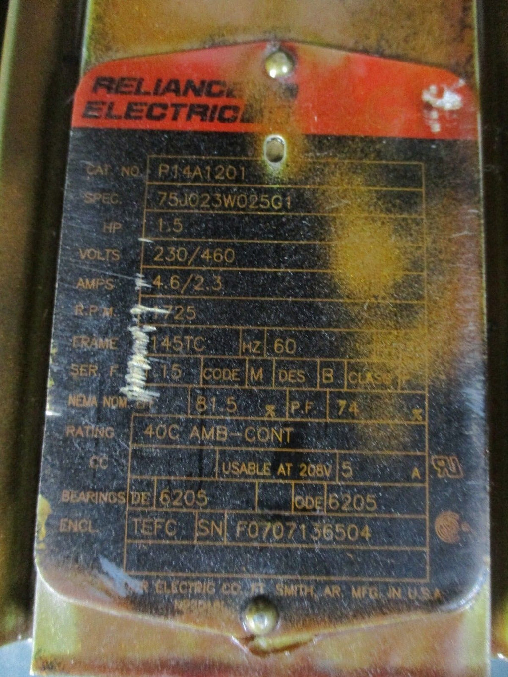 Reliance AC Motor P14A1201 1.5HP 1800RPM 230/460V 4.6/2.3A FR: 145TC Encl: TEFC_x000D_ Condition: UsedPower Source: ACMPN: P14A1201Brand: Reliance Reliance AC Motor P14A1201 1.5HP 1800RPM 230/460V 4.6/2.3A FR: 145TC Encl: TEFC Reliance AC Motor Part # P14A1201 1.5HP 1725RPM 230/460V 4.6/2.3A FR: 145TC Encl: TEFCUsedLOC AB6E2-19 Reliance AC Motor Part # P14A1201 1.5HP 1725RPM 230/460V 4.6/2.3A FR: 145TC Encl: TEFC Uséd LOC AB6E2-19