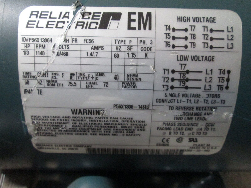 Reliance AC Motor P56X1306H 1/3HP 1140RPM 230/460V 1.4/0.7A 60Hz 3Ph Used