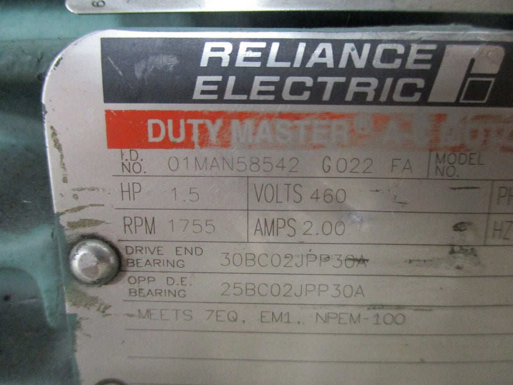 Reliance AI Duty Master AC Motor 01MAN58542 G022 FA 1.5HP 1800RPM 460V 2A Used
