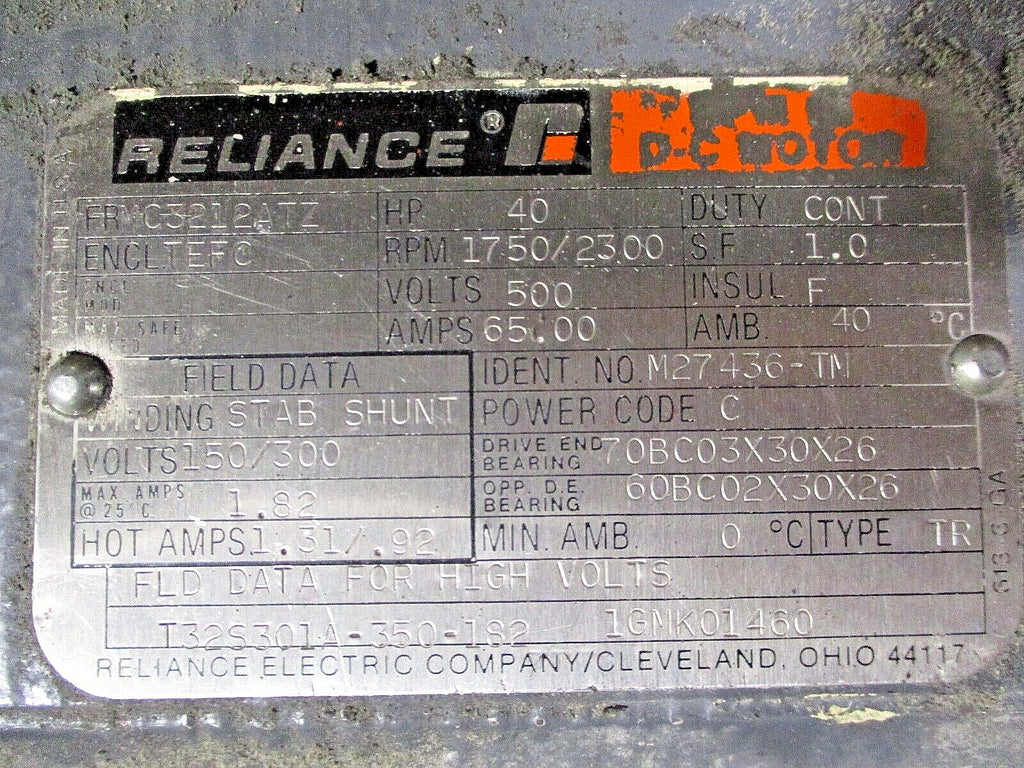 Reliance DC Motor 40HP 1800/2400RPM 500V 65A Used Reliance DC Motor 40 HP 1750 / 2300 RPM 500 V 65 ADims: 55" x 26" x 20"Weighs: 1200 LBS Used Loc: AB11-7244 / AB41U1 Reliance DC Motor 40 HP 1750 / 2300 RPM 500 V 65 ADims: 55" x 26" x 20"Weighs: 1200 LBS Uséd Loc: AB11-7244 / AB41U1
