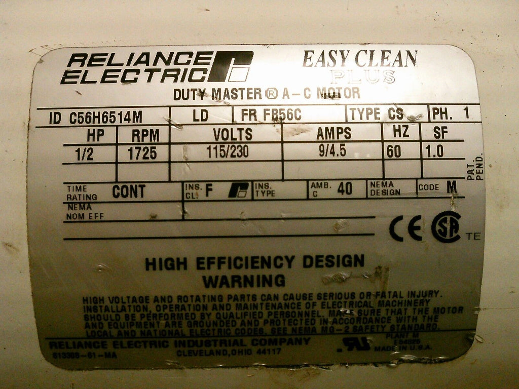 Reliance Duty Master AC Motor C56H6514M 0.5HP 1800RPM 115/230V 9/4.5A 60Hz Used