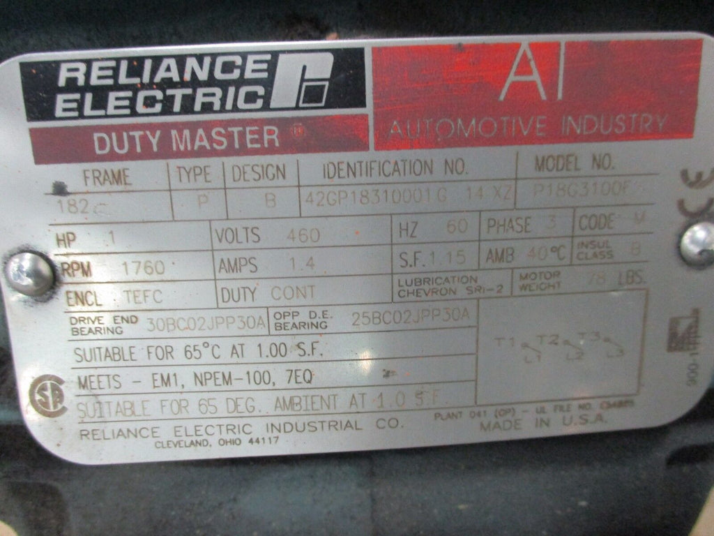 Reliance Duty Master AC Motor P18G3100F 1HP 1800RPM FR:182 ENCL:TEFC 460V 1.4A