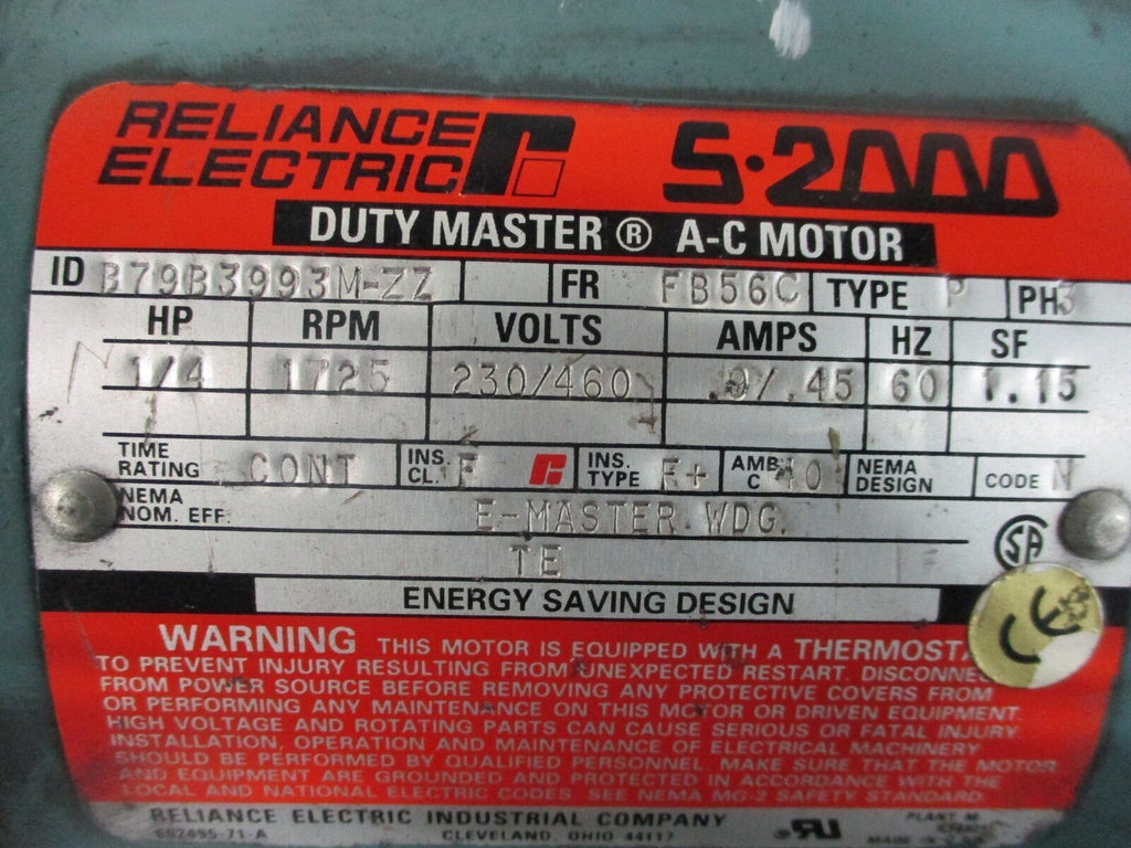 Reliance Duty Master AC Motor w/ Brake B79B3993M-ZZ 1/4HP 1800RPM FR:FB56C Used_x000D_ Condition: UsedCurrent Type: ACMPN: B79B3993M-ZZRated Load (HP): 1/4Special Motor Construction: Brake MotorBrand: Reliance Electric Reliance Duty Master AC Motor w/ Brake B79B3993M-ZZ 1/4HP 1800RPM FR:FB56C Used Reliance Duty Master AC Motor w/ BrakePart #: B79B3993M-ZZ 1/4HP 1725RPM Frame: FB56C 230/460V.9/.45A*Missing Terminal Box Cover*UsedLOC AB11-745 / AB38A3 Reliance Duty Master AC Motor w/ Brake Part #: B79B3993M-ZZ 1/4HP 1725RPM Frame: FB56C 230/460V .9/.45A *Missing Terminal Box Cover* Uséd LOC AB11-745 / AB38A3