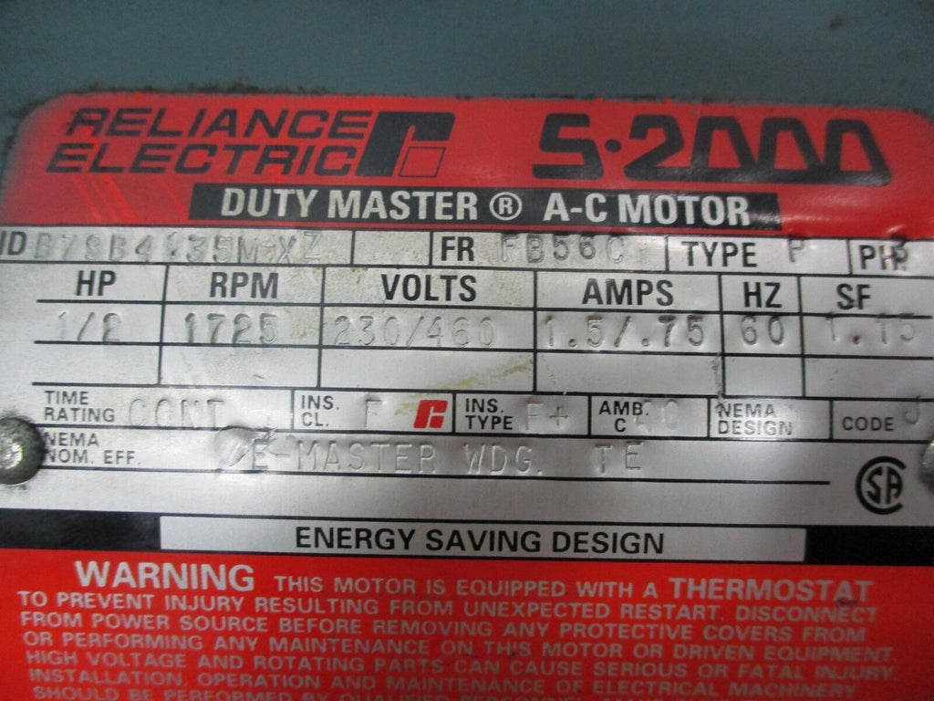 Reliance Duty Master AC Motor w/ Brake B79B4135M-XZ 1/2HP 1800RPM FR:FB56C Used_x000D_ Condition: UsedCurrent Type: ACMPN: B79B4135M-XZSpecial Motor Construction: Brake MotorBrand: Reliance Electric Reliance Duty Master AC Motor w/ Brake B79B4135M-XZ 1/2HP 1800RPM FR:FB56C Used Reliance Duty Master AC Motor w/ Brake Part #: B79B4135M-XZ 1/2HP 1725RPM Frame: FB56C 230/460V1.5/.75A *Missing Terminal Box Cover*UsedLOC AB11-709 / AB38I3/AB38J3/AB39J2 Reliance Duty Master AC Motor w/ Brake Part #: B79B4135M-XZ 1/2HP 1725RPM Frame: FB56C 230/460V 1.5/.75A *Missing Terminal Box Cover* Uséd LOC AB11-709 / AB38I3/AB38J3/AB39J2