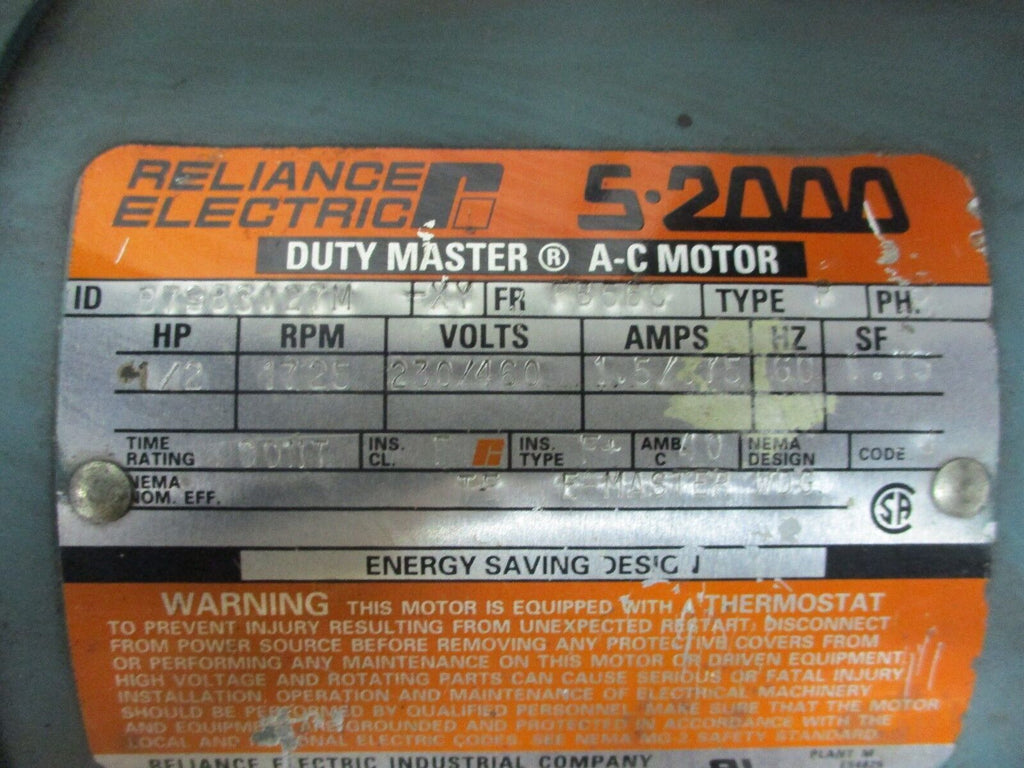 Reliance Duty Master Motor w/ Gear & Brake B797B3127M-XY 1/2HP 1800RPM FR:FB56C_x000D_ Condition: UsedMPN: B797B3127M-XYBrand: Reliance Electric Reliance Duty Master Motor w/ Gear & Brake B797B3127M-XY 1/2HP 1800RPM FR:FB56C Reliance Duty Master Motor w/ Gear & Brake Part #: B797B3127M-XY 1/2HP1725RPMFrame: FB56C230/460V1.5/.75AUsedLOC AB11-728 / AB39B2 Reliance Duty Master Motor w/ Gear & Brake Part #: B797B3127M-XY 1/2HP 1725RPM Frame: FB56C 230/460V 1.5/.75A Uséd LOC AB11-728 / AB39B2