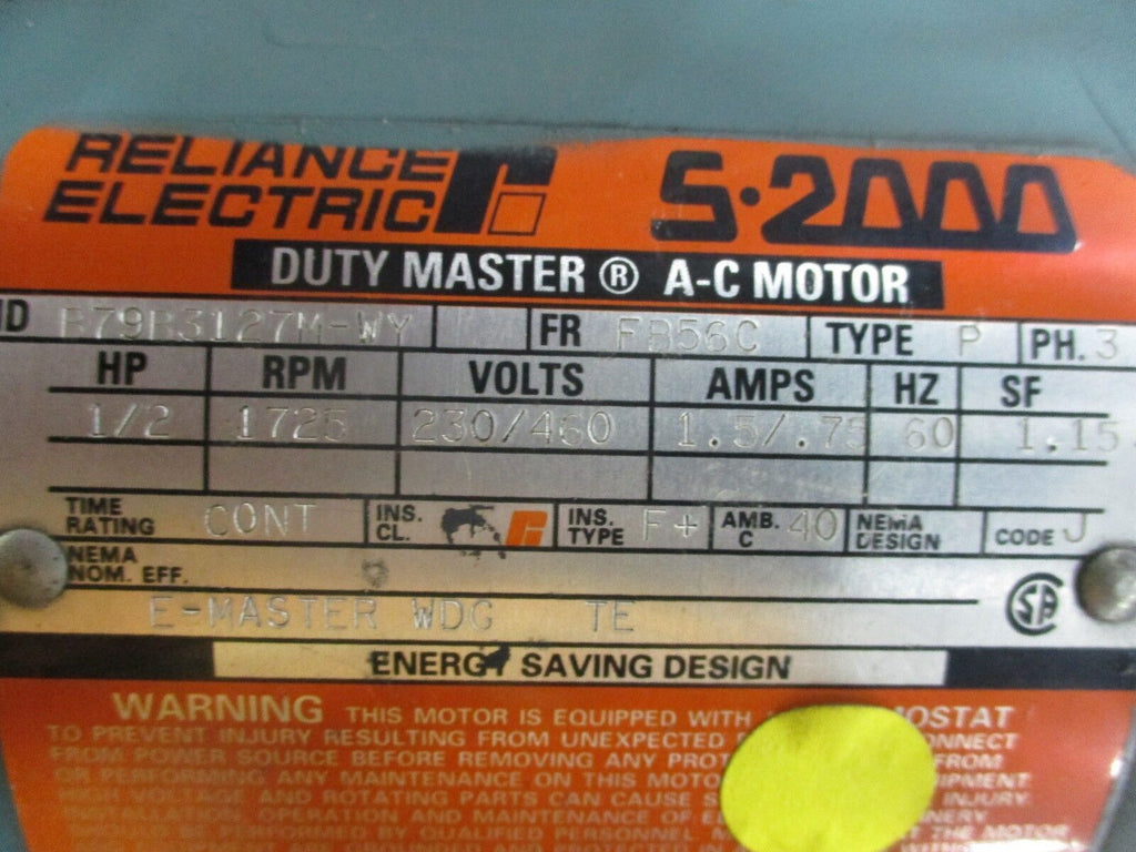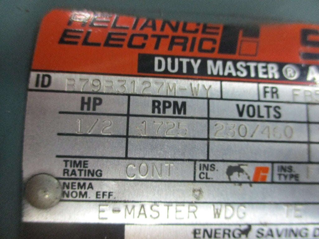 Reliance Duty Master Motor w/ Gear & Brake B79B3127M-WY FR: FB56C 1/2HP 1800RPM_x000D_ Condition: UsedMPN: B79B3127M-WYBrand: Reliance Electric Reliance Duty Master Motor w/ Gear & Brake B79B3127M-WY FR: FB56C 1/2HP 1800RPM Reliance Duty Master Motor w/ Gear & Brake Part #: B79B3127M-WY Frame: FB56C 1/2HP 1725RPM 230/460V1.5/.75AUsedLOC AB11-727 / AB39B2 Reliance Duty Master Motor w/ Gear & Brake Part #: B79B3127M-WY Frame: FB56C 1/2HP 1725RPM 230/460V 1.5/.75A Uséd LOC AB11-727 / AB39B2