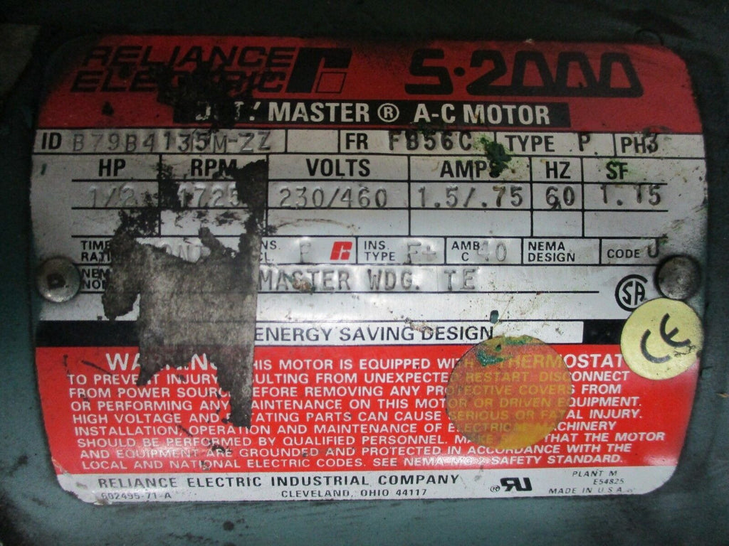 Reliance Duty Master Motor w/ Gear & Brake B79B4135M-ZZ 1/2HP 1800RPM FR:FB56C_x000D_ Condition: UsedMPN: B79B4135M-ZZBrand: Reliance Electric Reliance Duty Master Motor w/ Gear & Brake B79B4135M-ZZ 1/2HP 1800RPM FR:FB56C Reliance Duty Master Motor w/ Gear & Brake Part #: B79B4135M-ZZ 1/2HP 1725RPM Frame: FB56C230/460V 1.5/.75AUsedLOC AB11-714 / AB39C2 Reliance Duty Master Motor w/ Gear & Brake Part #: B79B4135M-ZZ 1/2HP 1725RPM Frame: FB56C 230/460V 1.5/.75A Uséd LOC AB11-714 / AB39C2