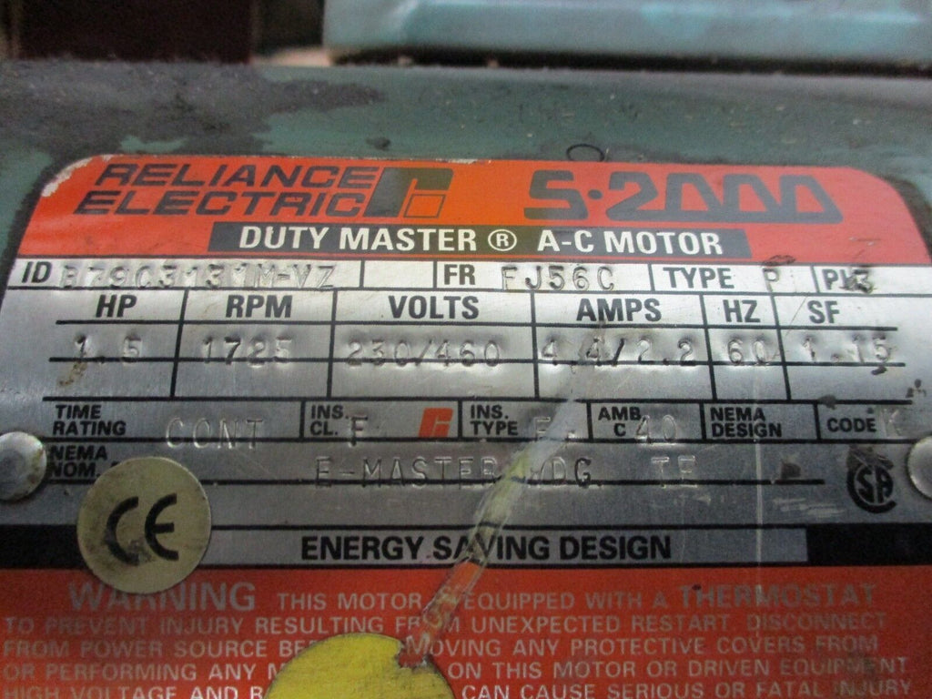 Reliance Duty Master Motor w/ Gear & Brake B79C3131M-VZ 1.5HP 1800RPM FR:FJ56C_x000D_ Condition: UsedMPN: B79C3131M-VZBrand: Reliance Electric Reliance Duty Master Motor w/ Gear & Brake B79C3131M-VZ 1.5HP 1800RPM FR:FJ56C Reliance Duty Master Motor w/ Gear & Brake Part #: B79C3131M-VZ 1.5HP 1725RPM Frame: FJ56C230/460V 4.4/2.2AUsedLOC AB11-713 / AB39C2 Reliance Duty Master Motor w/ Gear & Brake Part #: B79C3131M-VZ 1.5HP 1725RPM Frame: FJ56C 230/460V 4.4/2.2A Uséd LOC AB11-713 / AB39C2