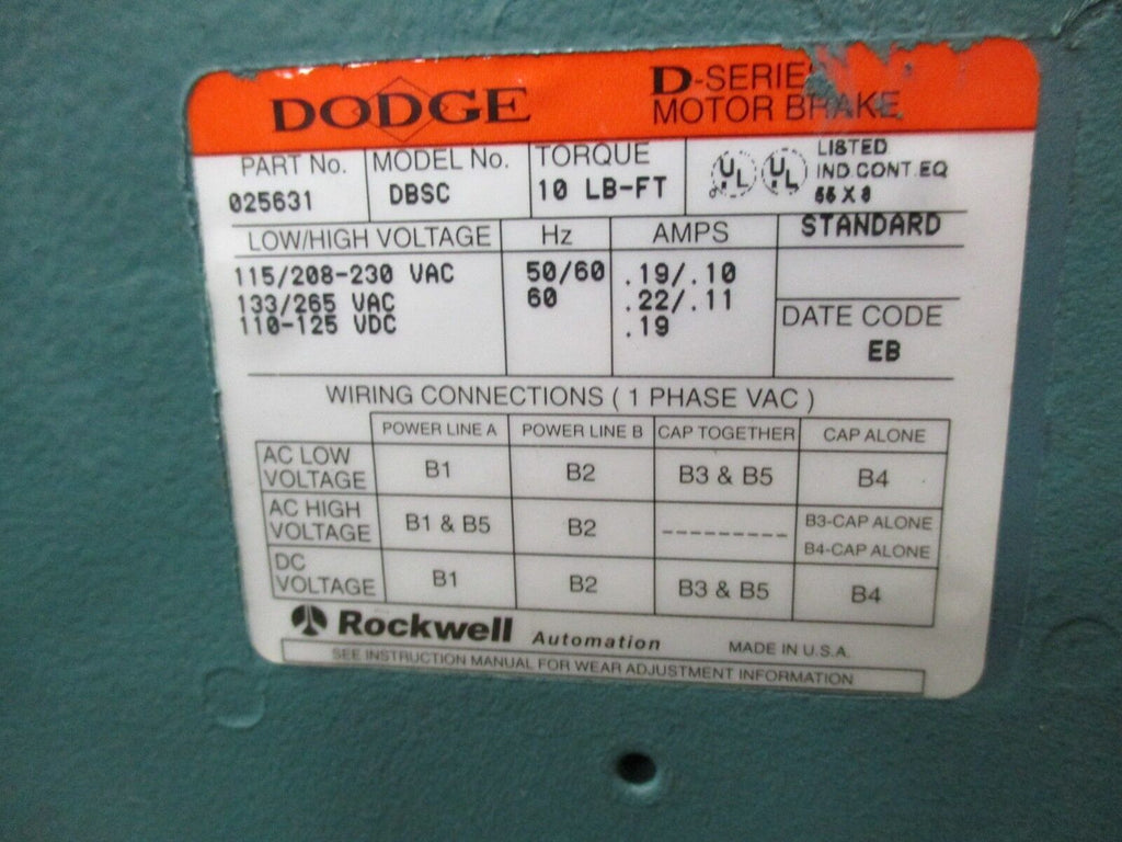 Reliance E-Master Duty Master AC Motor w/ Gear & Brake 01MR667793 G003 HB 3HP Condition: New – Open boxMPN: 01MR667793 G003 HBBrand: Reliance ElectricPower Source: AC Reliance E-Master Duty Master AC Motor w/ Gear & Brake 01MR667793 G003 HB 3HP Reliance E-Master Duty Master AC Motor w/ Gear & Brake Part #: 01MR667793 G003 HB / 3-182TC-DM2A-9.3-A33HP230/460V7.8/3.9A60Hz3Ph190RPM OutputTEFC Enclosure182TC FrameDodge Model DBSC Brake:Part #: 02563110 lb-ft TorqueNew SurplusLOC AB11-670 / AB38A4 Reliance E-Master Duty Master AC Motor w/ Gear & Brake Part #: 01MR667793 G003 HB / 3-182TC-DM2A-9.3-A3 3HP 230/460V 7.8/3.9A 60Hz 3Ph 190RPM Output TEFC Enclosure 182TC Frame Dodge Model DBSC Brake: Part #: 025631 10 lb-ft Torque New Surplus LOC AB11-670 / AB38A4