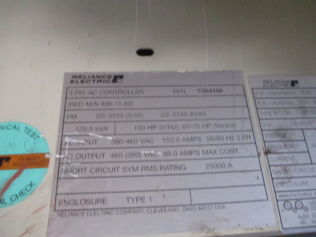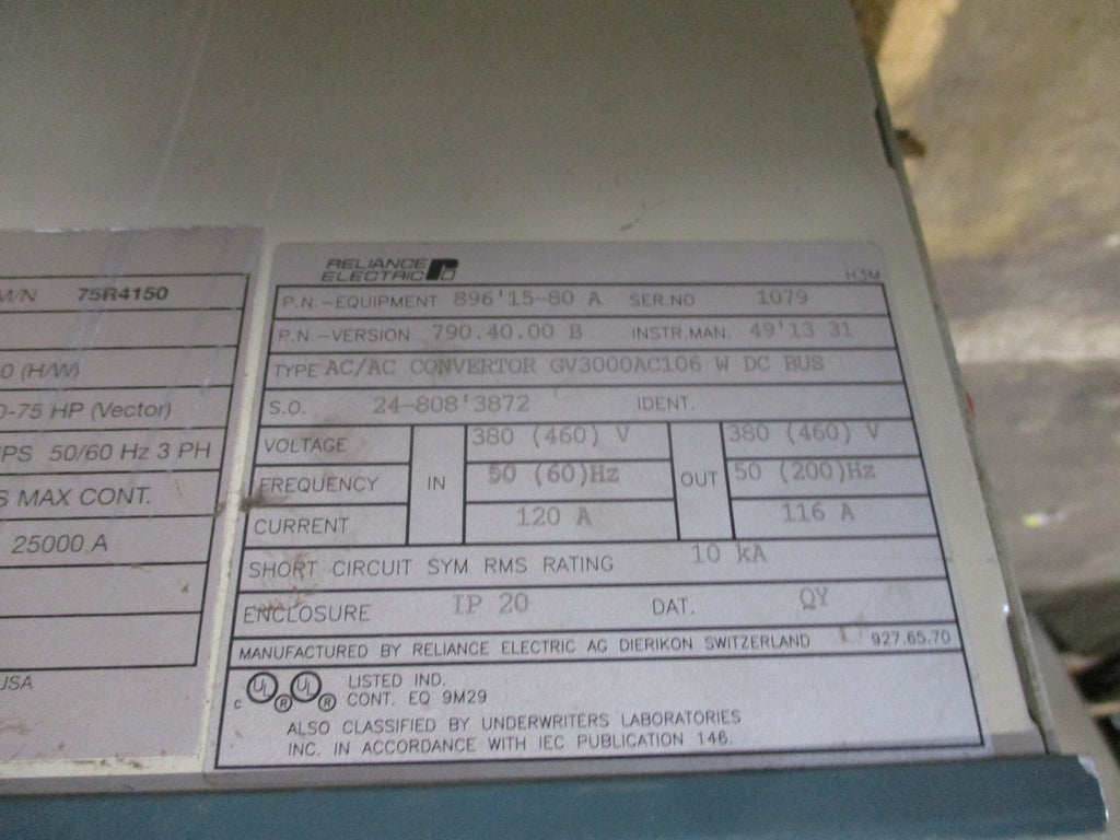 Reliance GV 3000 AC Drive 75R4150 100HP 3Ph Input: 380-460VAC 150.0A 50/60Hz 3PH Output: 460(380)VAC 89.0A Max Cont. Used_x000D_ Reliance GV 3000 AC Drive 75R4150 100HP 3Ph Input: 380-460VAC 150.0A 50/60Hz 3PH Output: 460(380)VAC 89.0A Max Cont. *Missing (3) Cover Screws* Weighs: 195 LBS Used LOC AB11-7865 / AB37B2