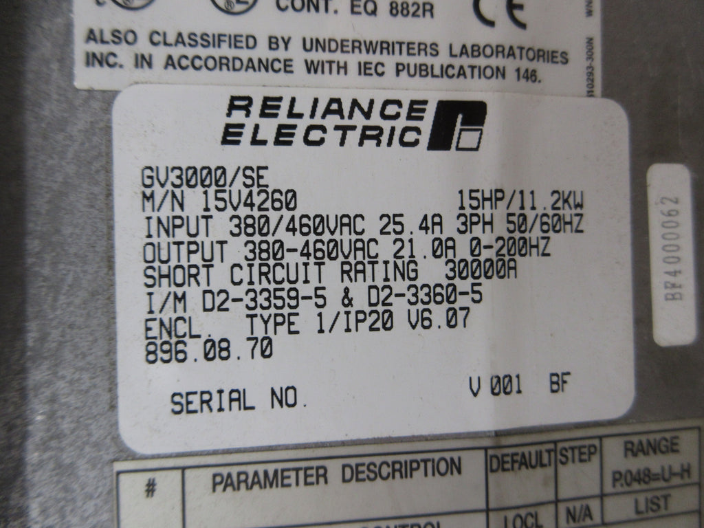 Reliance GV3000/SE AC Drive Part #: 15V4260 15 HP 3Ph Input: 380/460 VAC 25.4 A 50/60 Hz Output: 380-460 VAC 21 A 0-200 Hz Used Loc: AB11-8328 / AB24J2