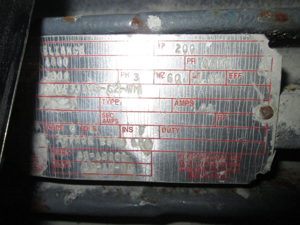 Reliance Motor 2MVF33193-G2-WM 200HP 1800 RPM's 2300V 44A_x000D_ Condition: UsedBrand: RelianceModel: Motor MPN: 2MVF33193-G2-WM Reliance Motor 2MVF33193-G2-WM 200HP 1800 RPM's 2300V 44A Reliance Motor 2MVF33193-G2-WM 200HP 1800 RPM's 2300V 44A44TT FrameCondition: UsedLoc: TR5-12 / AB6C3-1 Reliance Motor 2MVF33193-G2-WM 200HP 1800 RPM's 2300V 44A 44TT Frame Condition: Uséd Loc: TR5-12 / AB6C3-1