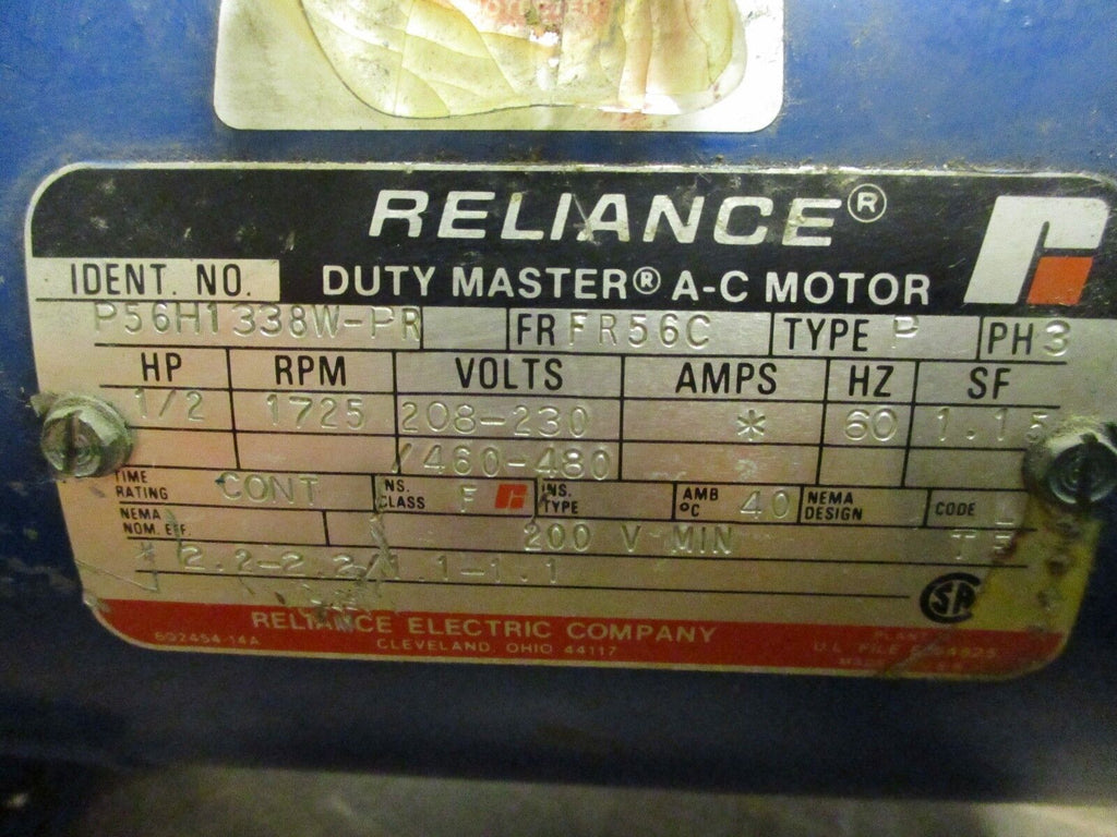 Reliance Motor w/ Gear P56H1338W-PR 1/2HP 1800RPM FR:FR56C 208-230/460-480V Used_x000D_ Condition: UsedModified Item: NoCustom Bundle: NoCurrent Type: ACMPN: P56H1338W-PRBrand: Reliance Electric Reliance Motor w/ Gear P56H1338W-PR 1/2HP 1800RPM FR:FR56C 208-230/460-480V Used Reliance Motor w/ Gear Part #: P56H1338W-PR 1/2HP 1725RPM Frame: FR56C 208-230/460-480V 2.2-2.2/1.1-1.1AUsedLOC AB11-544 / AB3M3 Reliance Motor w/ Gear Part #: P56H1338W-PR 1/2HP 1725RPM Frame: FR56C 208-230/460-480V 2.2-2.2/1.1-1.1A Uséd LOC AB11-544 / AB3M3