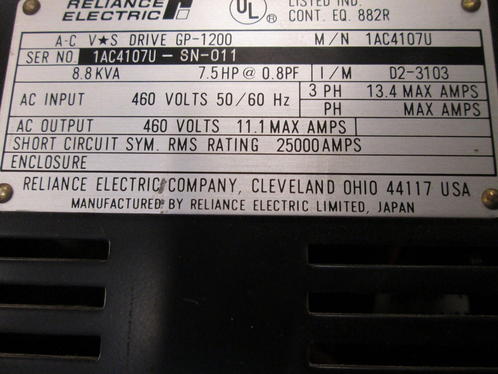 Reliance VS AC Drive 1AC4107U 7.5HP Used_x000D_ Condition: UsedBrand: RelianceModel: VS AC DriveMPN: 1AC4107U Reliance VS AC Drive 1AC4107U 7.5HP Used Reliance VS AC Drive Part # 1AC4107U 7.5HP Input: 460V, 50/60Hz, 3Ph, 13.4AOutput: 460V, 11.1AUsedLOC: 23C4-4 Reliance VS AC Drive Part # 1AC4107U 7.5HP Input: 460V, 50/60Hz, 3Ph, 13.4A Output: 460V, 11.1A Uséd LOC: 23C4-4