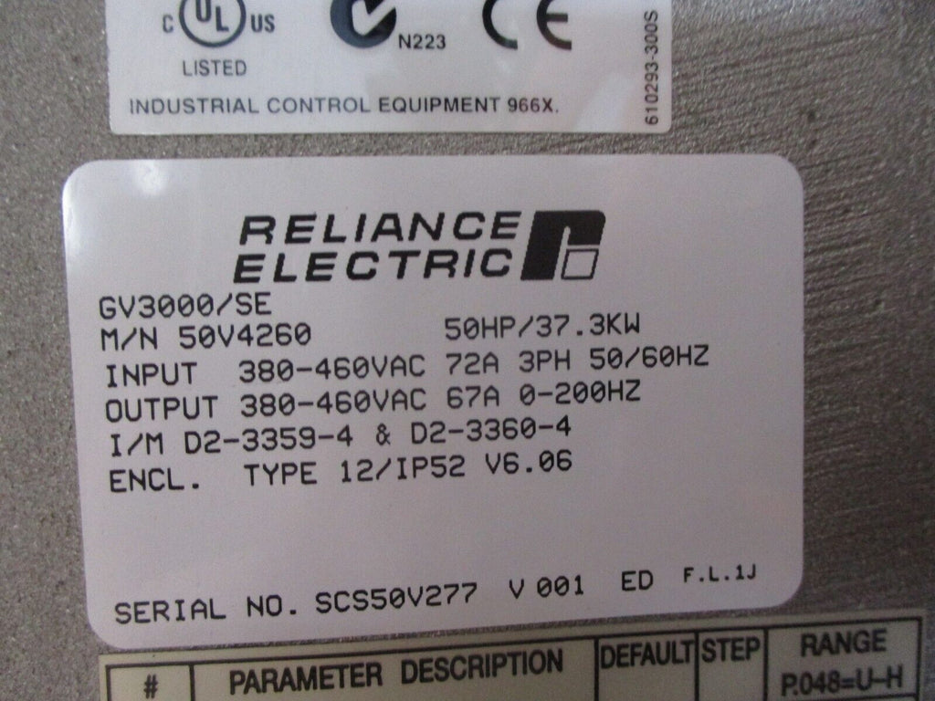 Reliance VTAC 7 GV3000/SE AC Drive 50V4260 50HP Type 12 Enclosure Used Condition: Used Brand: Reliance Type: General Purpose AC Drive Maximum Load: 50 HP MPN: 50V4260 Input Voltage: 380-460 VAC Reliance VTAC 7 GV3000/SE AC Drive 50V4260 50HP Type 12 Enclosure Used Reliance VTAC 7 GV3000/SE AC Drive Part #: 50V4260 50 HP Input: 380-460 VAC 72 A 3Ph 50/60 Hz Output: 380-460 VAC 67 A 0-200 Hz Type 12 Enclosure Uséd Weighs: 60 LBS Loc: AB11-4992 / AB7C3 / AB37F2 / AB36G2 / AB36B2