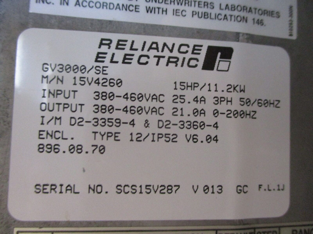 Reliance VTAC7 GV3000/SE AC Drive 15V4260 15HP Type 12 Enclosure Used