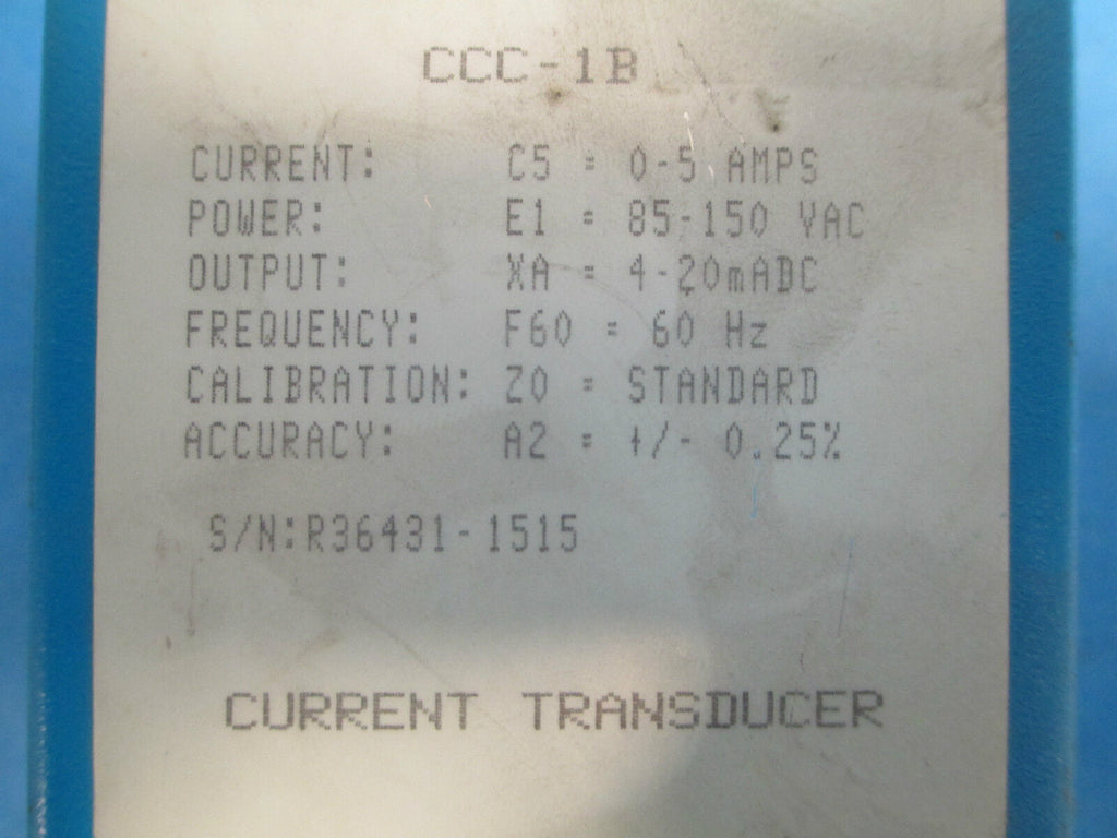 Rochester Instrument Systems Current Transducer CCC-1B_x000D_ Condition: UsedBrand: Rochester Instrument SystemsModel: Current TransducerMPN: CCC-1B Rochester Instrument Systems Current Transducer CCC-1B Condition: UsedBrand: Rochester Instrument SystemsModel: Current TransducerMPN: CCC-1BRochester Instrument Systems Current Transducer Part # CCC-1B Current: 0-5A Power: 85-150VAC Output: 4-20mADC Used Loc 5C5-9
