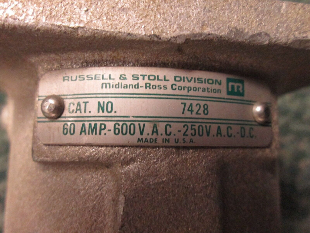 Russellstoll Receptacle 7428 60A 600V 3W +G Used_x000D_ Condition: UsedBrand: RussellstollModel: ReceptacleMPN: 7428 Russellstoll Receptacle 7428 60A 600V 3W +G Used Condition: UsedBrand: RussellstollModel: ReceptacleMPN: 7428 Russellstoll Receptacle Part # 7428 60A 600V 3W +G Used LOC: 13D3-12