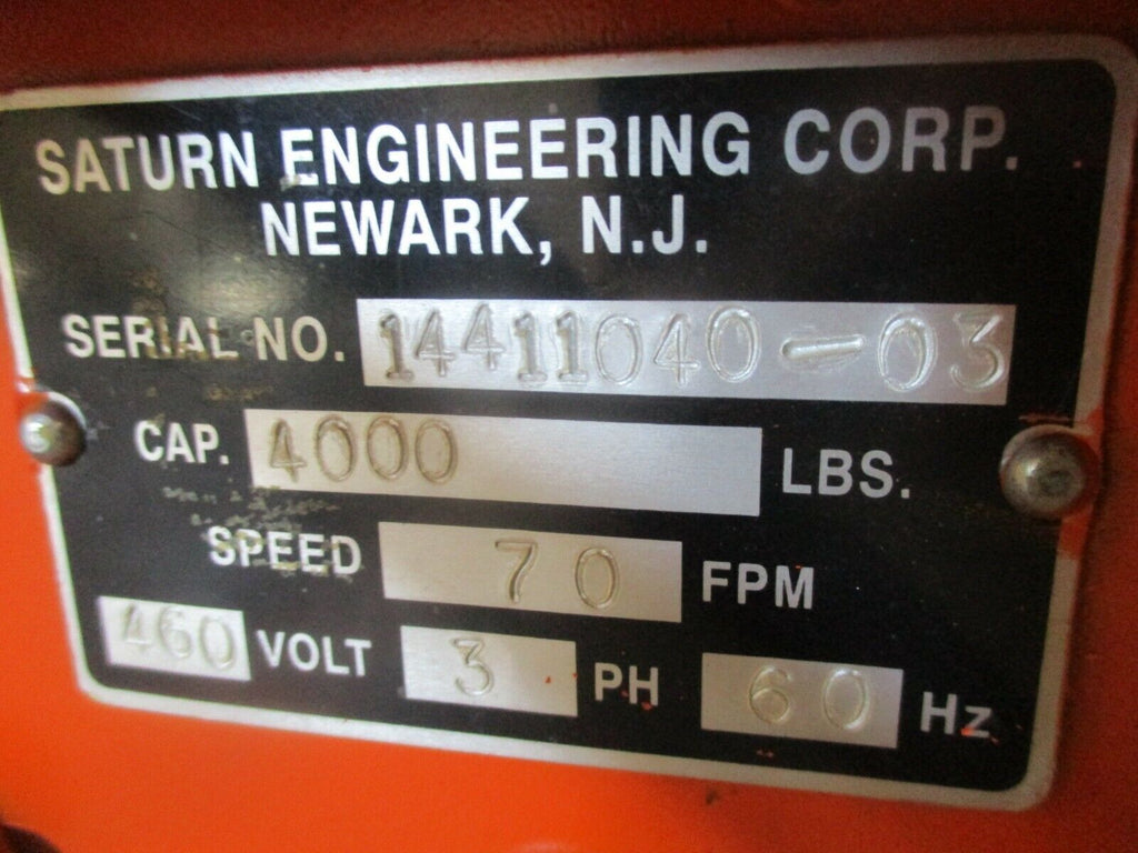 Saturn Engineering 2-Ton Hoist Capacity: 4000lbs 7.0FPM 460V 3Ph 60Hz Used_x000D_ Condition: UsedModified Item: NoMPN: Does Not ApplyCustom Bundle: NoBrand: Saturn Engineering Saturn Engineering 2-Ton Hoist Capacity: 4000lbs 7.0FPM 460V 3Ph 60Hz Used Condition: UsedModified Item: NoMPN: Does Not ApplyCustom Bundle: NoBrand: Saturn Engineering Saturn Engineering 2-Ton Hoist Capacity: 4000lbs 7.0FPM 460V 3Ph 60Hz Used LOC AB38C4-1