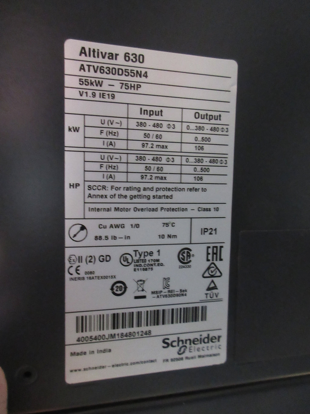Schneider Electric Altivar 630 AC Drive Part #: ATV630D55N4 75 HP 3Ph Input: 380-480 V 50/60 Hz 97.2 A Max Output: 0-380/480 V 0-500 Hz 106 A w/ Keypad Dims: 39" x 12" x 13" Weighs: 200 LBS Used Loc: AB11-9247 / AB34C2