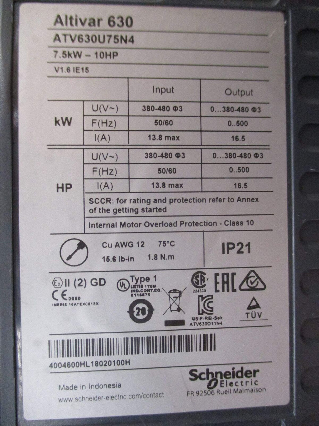 Schneider Electric Altivar 630 AC Drive ATV630U75N4 10HP 3Ph w/ Keypad Used Schneider Electric Altivar 630 AC Drive Part #: ATV630U75N4 10 HP 3Ph Input: 380-480 V 50/60 Hz 13.8 A Max Output: 0...380-480 V 0...500 Hz 16.5 A w/ Keypad Used Loc: AB11-7495 / AB4H2