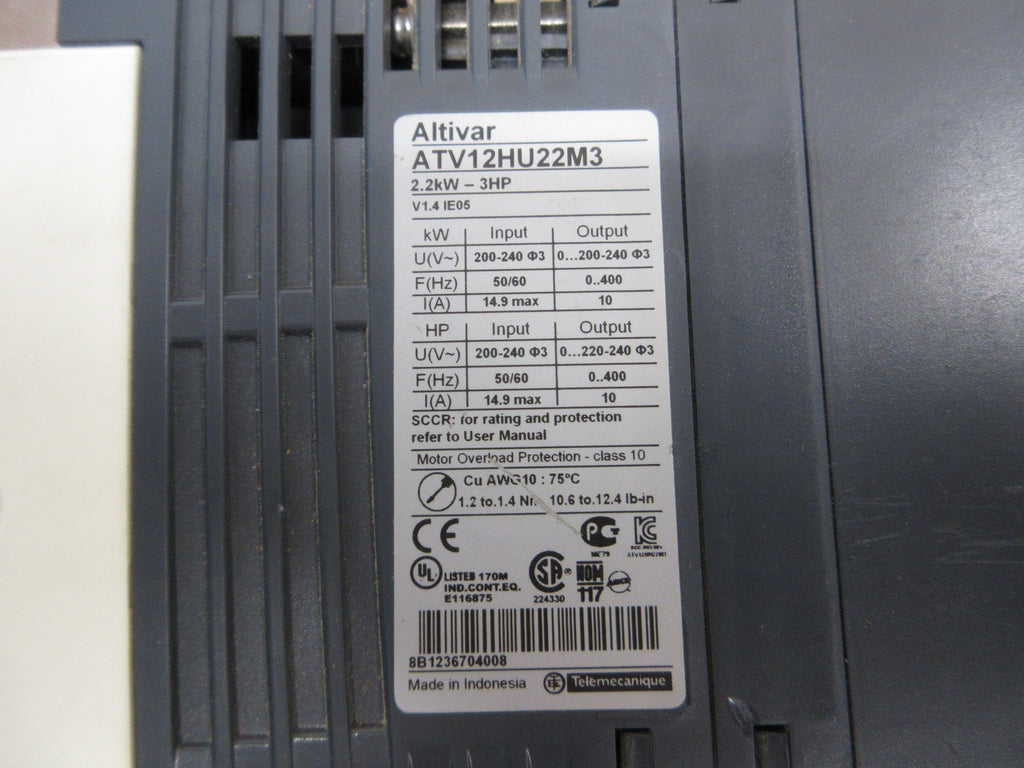 Schneider Electric Altivar AC Drive Part #: ATV12HU22M3 3 HP 3Ph Input: 200-240 V 50/60 Hz 14.9 A Max Output: 0...200-240 V 0-400 Hz 10 A Used Loc: 57G3-8