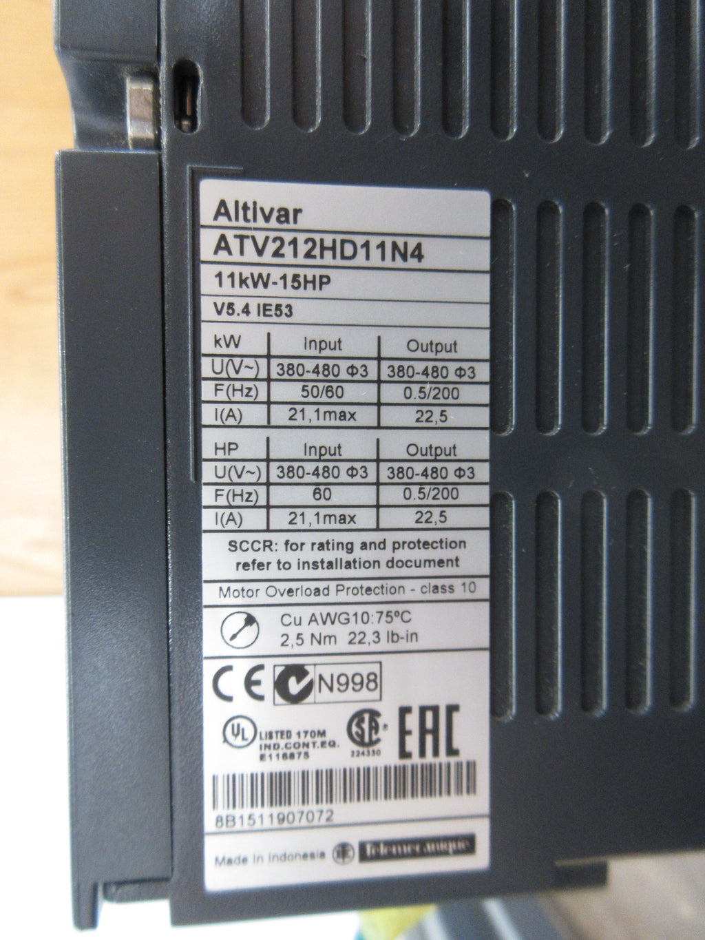 Schneider Electric Altivar AC Drive Part #: ATV212HD11N4 15 HP 3Ph Input: 380-480 V 60 Hz 21.1 A Max Output: 380-480 V 0.5/200 Hz 22.5 A Used Loc: 57B2-22 / 57B1