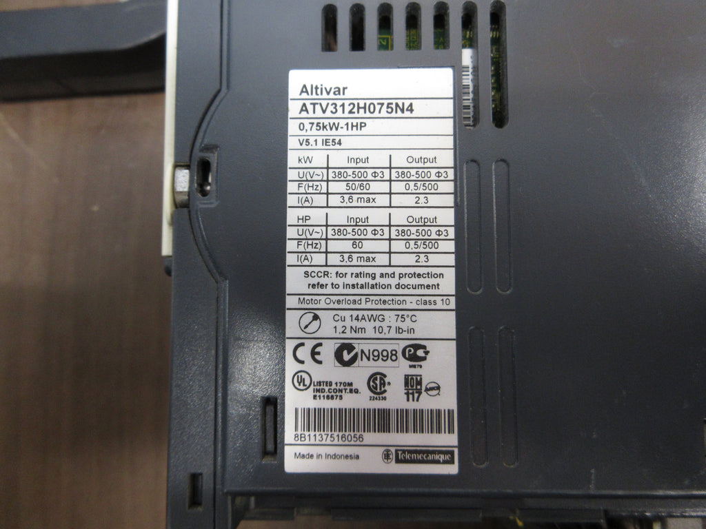 Schneider Electric Altivar AC Drive Part #: ATV312H075N4 1 HP 3Ph Input: 380-500 V 60 Hz 3.6 A Output: 380-500 V 0.5/500 Hz 2.3 A w/ Keypad Used Loc: 57G3-6