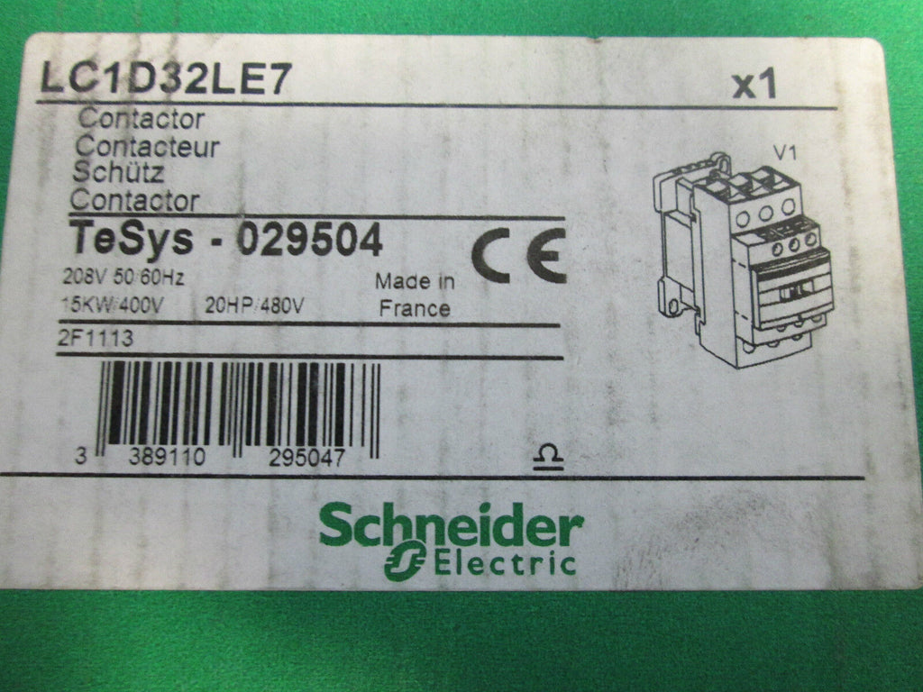 Schneider Electric LC1D32LE7 IEC Open 3P Contactor 208VAC 32A Condition: NewAuxiliary Contact Form: 1NO/1NCBrand: SCHNEIDER ELECTRICCode: ECoil Volts: 208VACContactor Type: IECEnclosure Type: OpenFull Load Amps-Inductive: 32Full Load Amps-Resistive: 50HP @ 1 Phase - 120V: 2HP @ 1 Phase - 230V: 5Hz: 50/60MPN: LC1D32LE7Number of Poles: 3SKU: G0725654Standards: UL,CSA Schneider Electric LC1D32LE7 IEC Open 3P Contactor 208VAC 32A Condition: NewBrand: SCHNEIDER ELECTRICMPN: LC1D32LE7SKU: G0725654Enclosure Type: OpenNumber of Poles: 3Contactor Type: IECCoil Volts: 208VACHz: 50/60Auxiliary Contact Form: 1NO/1NCStandards: UL,CSACode: EFull Load Amps-Inductive: 32Full Load Amps-Resistive: 50HP @ 1 Phase - 120V: 2HP @ 1 Phase - 230V: 5Schneider Electric LC1D32LE7 IEC Open 3P Contactor 208VAC 32A Loc. 6D4-16