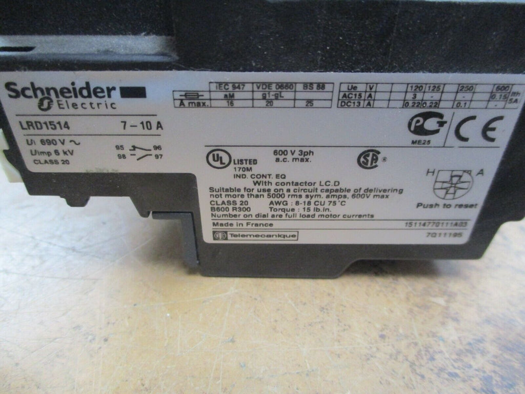Schneider Electric Solid State Overload LRD1514 Trip: 7-10A Used Condition: UsedMPN: LRD1514Brand: Schneider Electric Schneider Electric Solid State Overload LRD1514 Trip: 7-10A Used Condition: UsedMPN: LRD1514Brand: Schneider ElectricSchneider Electric Solid State Overload Part #: LRD1514 Trip: 7-10A Used LOC 17A5-47