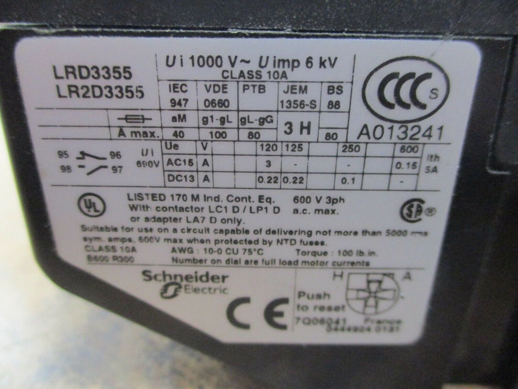 Schneider Electric Solid State Overload LRD3355/LR2D3355 Trip: 30-40A Used_x000D_ Condition: UsedMPN: LRD3355/LR2D3355Brand: Schneider Electric Schneider Electric Solid State Overload LRD3355/LR2D3355 Trip: 30-40A Used Condition: UsedMPN: LRD3355/LR2D3355Brand: Schneider ElectricSchneider Electric Solid State Overload Part #: LRD3355/LR2D3355 Trip: 30-40A Used LOC 17A5-58