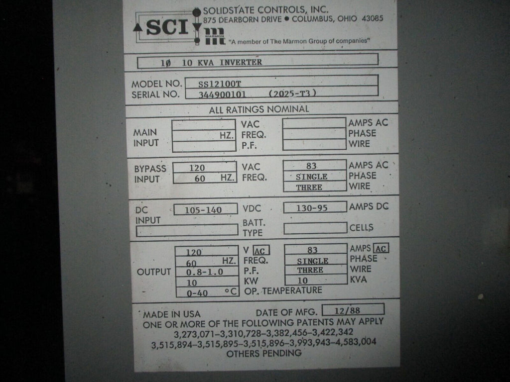 SCI 10 KVA Inverter SS12100T Input: 105-140VDC 130-95A Used_x000D_ Condition: UsedMPN: SS12100TBrand: SCI SCI 10 KVA Inverter SS12100T Input: 105-140VDC 130-95A Used Condition: UsedMPN: SS12100TBrand: SCISCI 10 KVA Inverter Part #: SS12100T Input: 105-140 VDC 130-95 A Output: 120 VAC 83 A 60 Hz 1Ph 3W 10 KVA Used Loc: AB11-4515
