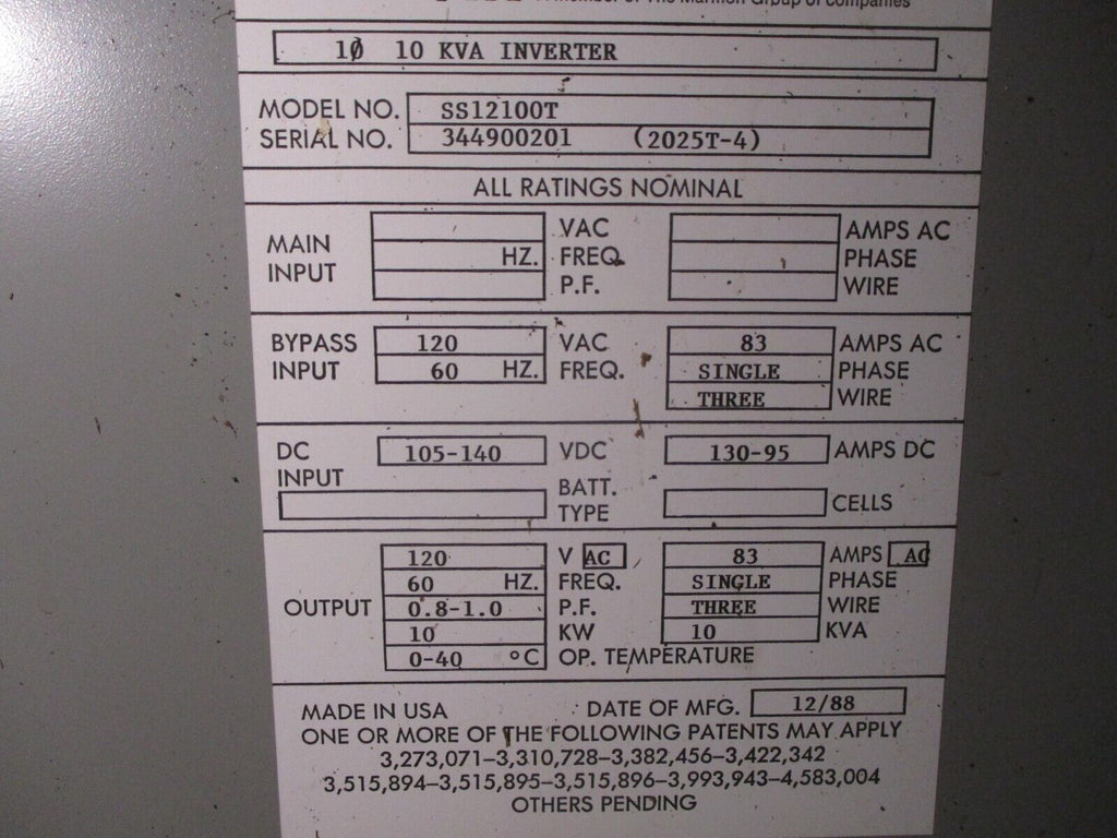 SCI 10 KVA Inverter Part #: SS12100T Input: 105-140 VDC 130-95 A Output:120 VAC83 A60 Hz1Ph3W10 KVAUsed Loc: AB11-4517- Part #: SS12100T
