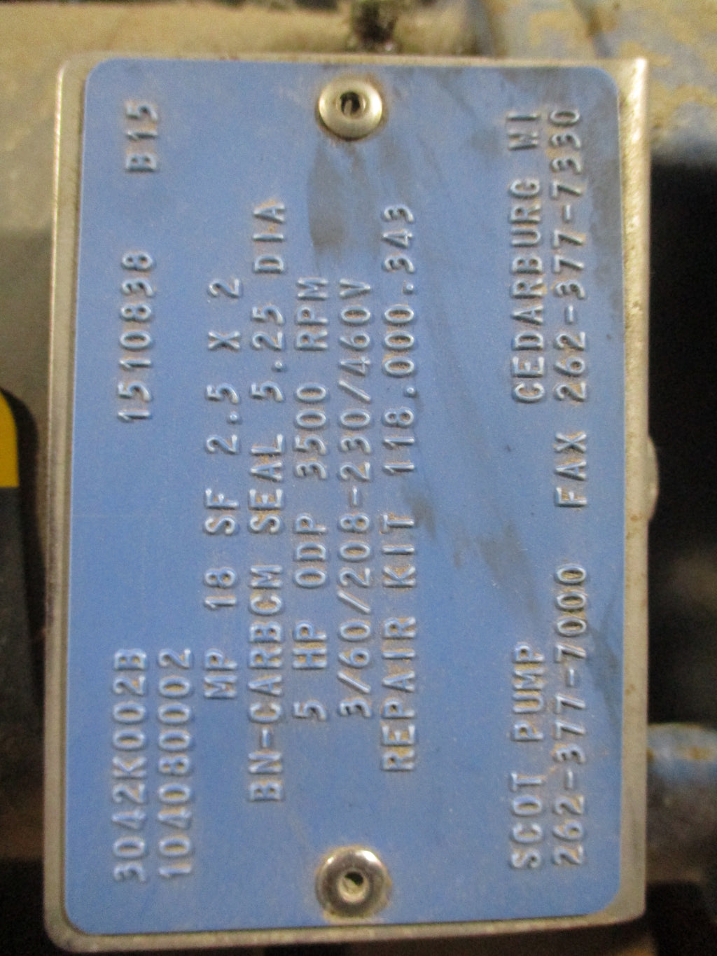 Scot Pump Pump 3042K002B 5HP 3500RPM 208-230/460V 3Ph 60Hz Used