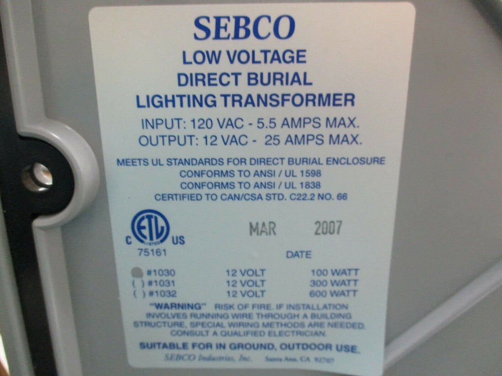 Sebco Direct Burial Low Voltage Lighting Transformer 1030 12V 100W New Surplus_x000D_ Condition: New – Open boxMPN: 1030Brand: SebcoVoltage Rating: 12 V Sebco Direct Burial Low Voltage Lighting Transformer 1030 12V 100W New Surplus Condition: New – Open boxMPN: 1030Brand: SebcoVoltage Rating: 12 VSebco Direct Burial Low Voltage Lighting Transformer Part #: 1030 12V 100W New Surplus LOC 8E2-8 / AB9D2