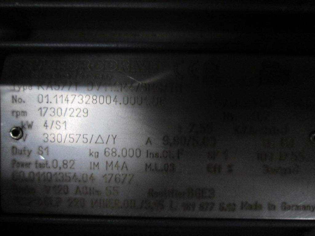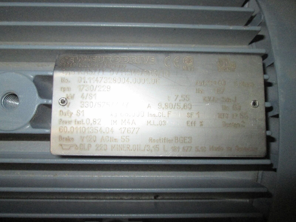 Sew-Eurodrive Gear Motor KA57/TDV/112M4/BMG/TH 4KW 1730-229RPMs 3Ph Used