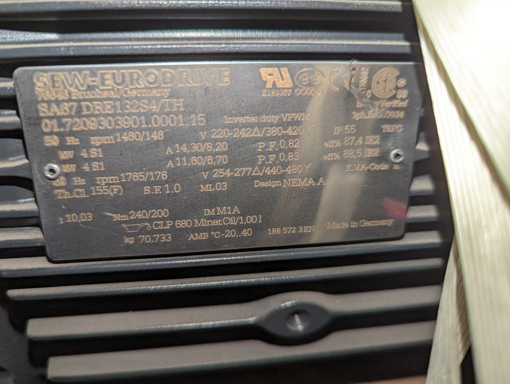 SEW-EURODRIVE Gearmotor SA67 DRE132S4/TH 5HP 11.60/6.70A 254-277/440-480V 60Hz