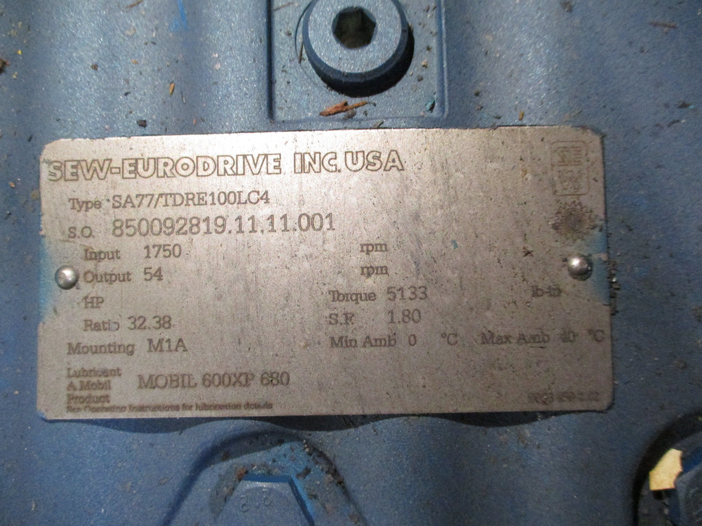 Sew-Eurodrive Gearmotor SA77/TDRE100LC4 5HP 54RPM Output 230/460V 60Hz 3Ph