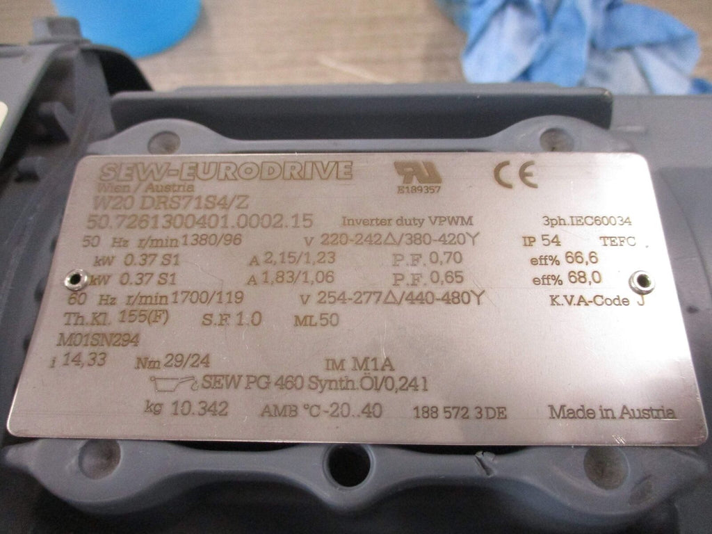Sew-Eurodrive Gearmotor W20 DRS71S4/Z 0.5HP 96RPM Out 277/480V Used_x000D_ Sew-Eurodrive Gearmotor W20 DRS71S4/Z 0.5HP 96RPM Out 277/480V Used LOC 60B1-2