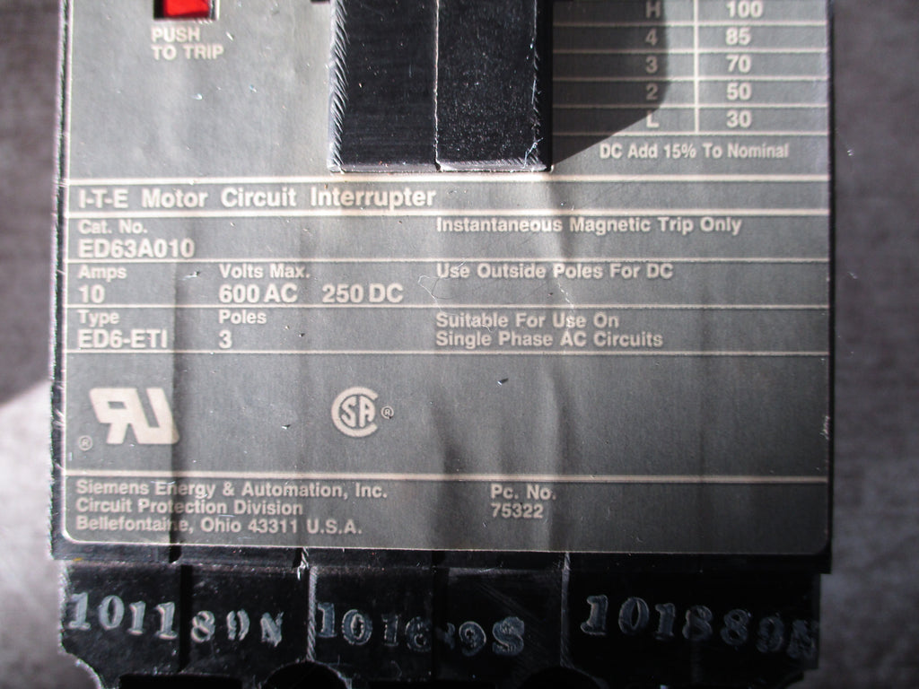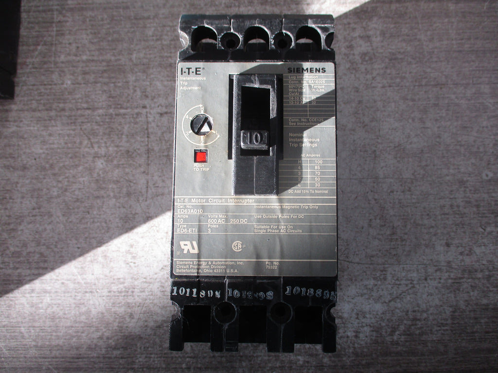 Siemens Circuit Breaker ED63A010 10A 600V 3P Used LOC 58B2-20