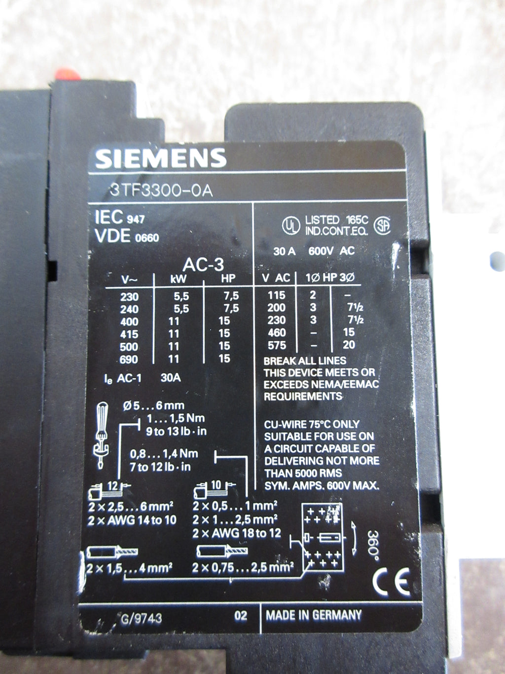 Siemens Contactor Part #: 3TF3300-0A 24V Coil 30A 600V w/ (1) ...