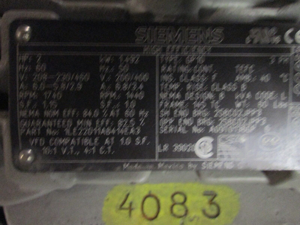 Siemens Motor & Gear Set 1LE22011AB414EA3 2HP 1740RPM 145TC Frame 208-230/460V_x000D_ Condition: UsedBrand: SiemensModel: Motor & Gear SetMPN: 1LE22011AB414EA3 Siemens Motor & Gear Set 1LE22011AB414EA3 2HP 1740RPM 145TC Frame 208-230/460V Condition: UsedBrand: SiemensModel: Motor & Gear SetMPN: 1LE22011AB414EA3 Siemens Motor & Gear Set Part #: 1LE22011AB414EA3 2HP 1740RPM 145TC Frame 208-230/460V 6-5..8/2.9A Gear: 2-3/4RPM Used LOC TR6-5 / AB5A3-1