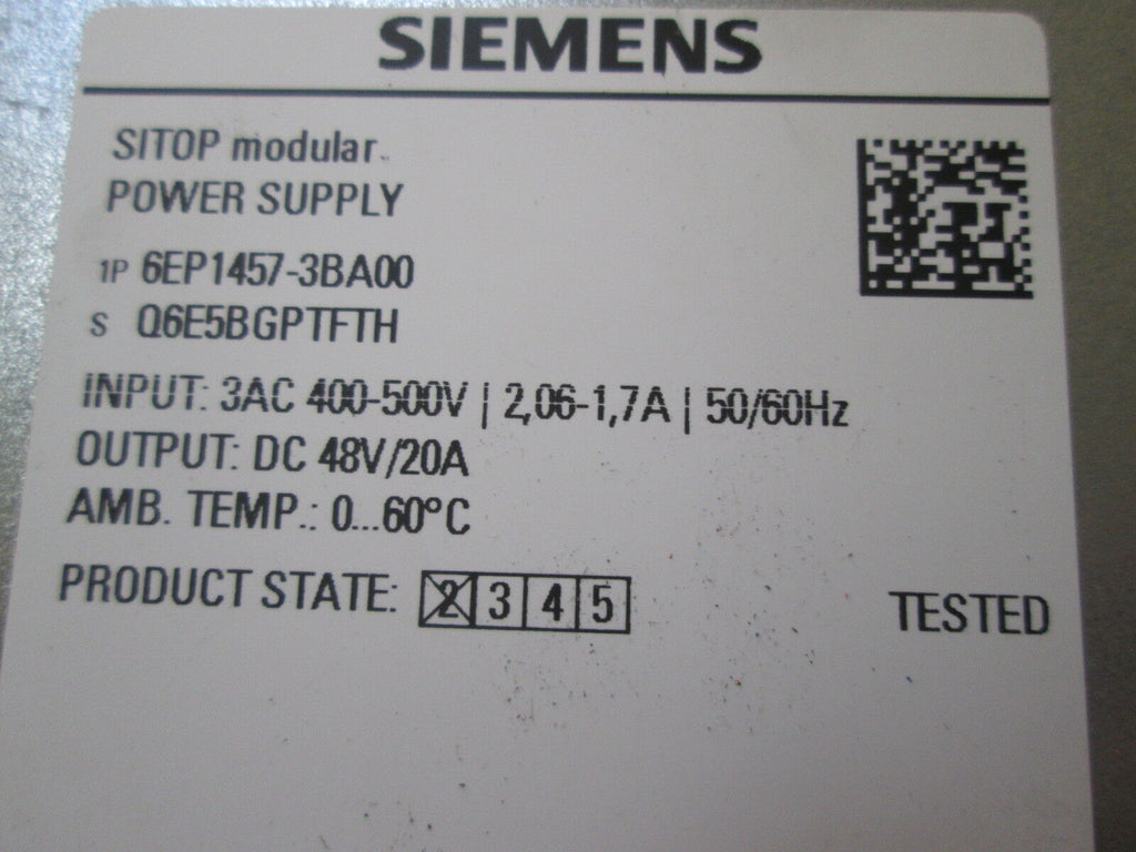 Siemens SITOP PSU300M modular Power Supply 6EP1457-3BA00 Used_x000D_ Condition: UsedBrand: SiemensMPN: 6EP1457-3BA00 Siemens SITOP PSU300M modular Power Supply 6EP1457-3BA00 Used Condition: UsedBrand: SiemensMPN: 6EP1457-3BA00 Siemens SITOP PSU300M modular Power Supply Part # 6EP1457-3BA00 Inputs: 400-500V, 2.06/1.7A, 50/60Hz Outputs: 48V, 20A Used LOC 13K1-2
