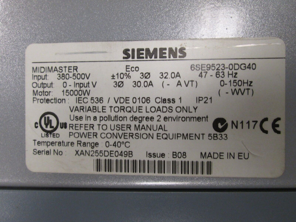 Siemens Midimaster Eco AC Drive Part # 6SE9523-0DG40 20HP Inp...