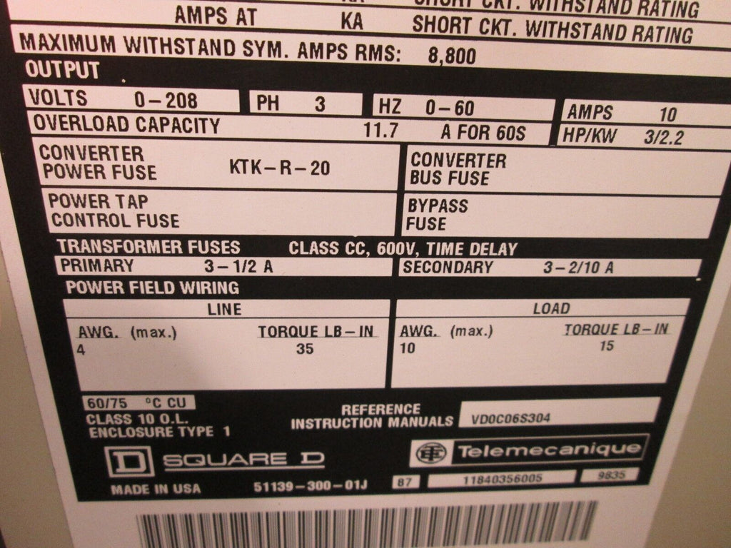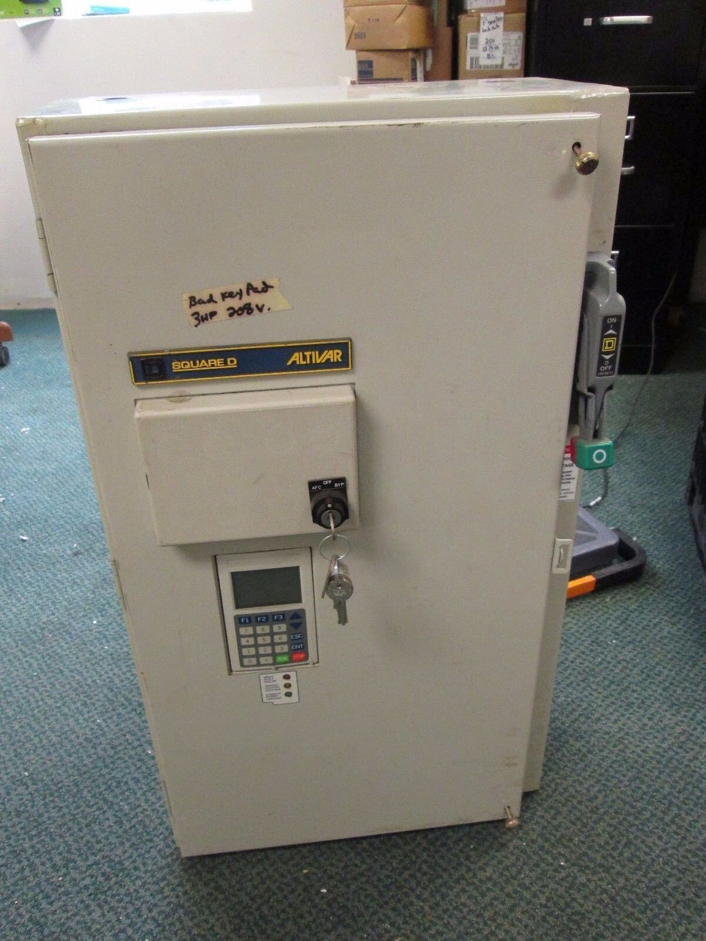 Square D Altivar 55 Bypass & AC Drive 8839ATV66U41M2 3HP *Bad Keypad* Used Condition: UsedModel: Altivar 55 Bypass & AC DriveMPN: 8839ATV66U41M2Brand: Square D Square D Altivar 55 Bypass & AC Drive 8839ATV66U41M2 3HP *Bad Keypad* Used Condition: UsedModel: Altivar 55 Bypass & AC DriveMPN: 8839ATV66U41M2Brand: Square DSquare D Altivar 55 Bypass & AC Drive Part # 8839ATV66U41M2 3HP Input: 208V +/- 10%, 60Hz, 14.3A @ 8.8KA Output: 0-208V, 0-60Hz, 10A Bad Keypad Used LOC: 9B2-10 / AB13E3