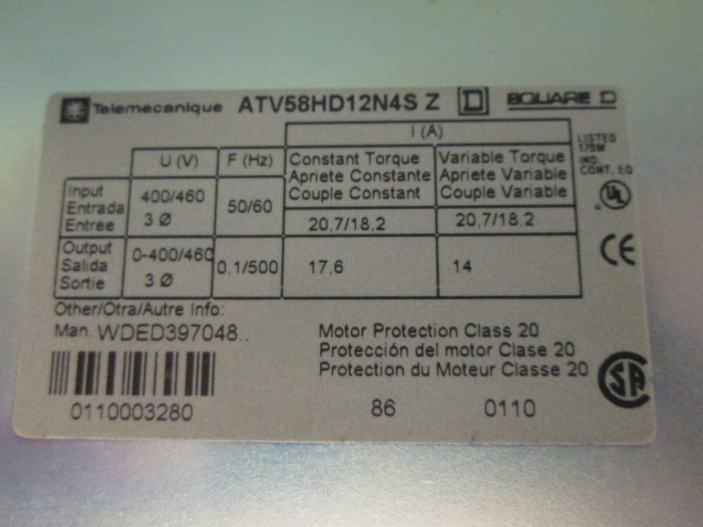Square D Altivar 58 AC Drive ATV58HD12N4SZ 10HP 460V Used_x000D_ Condition: UsedMaximum Load: 10 HPBrand: Square DType: General Purpose AC DriveInput Voltage: 460 VModel: Altivar 58 AC DriveMPN: ATV58HD12N4SZ Square D Altivar 58 AC Drive ATV58HD12N4SZ 10HP 460V Used Square D Altivar 58 AC Drive Part # ATV58HD12N4SZ 10HP Input: 400/460V, 3Ph, 50/60Hz, 20.7/18.2AOutput: 0-400/460V, 3Ph, 0.1/500Hz, 17.6AUsedLOC: 24A3-3 Square D Altivar 58 AC Drive Part # ATV58HD12N4SZ 10HP Input: 400/460V, 3Ph, 50/60Hz, 20.7/18.2A Output: 0-400/460V, 3Ph, 0.1/500Hz, 17.6A Uséd LOC: 24A3-3