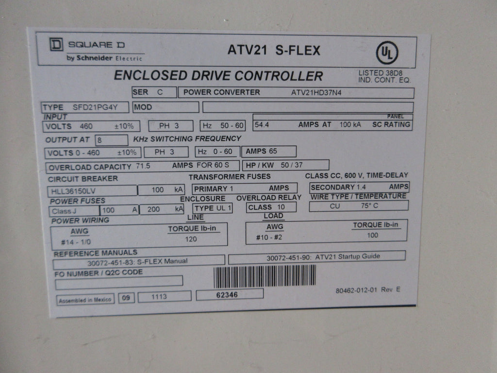 Square D ATV21 S-Flex AC Drive w/ Bypass Part #: ATV21HD37N4 Type: SFD21PG4Y 50 HP 3Ph Input: 460 V 50-60 Hz 54.4 A Output: 0-460 V 0-60 Hz 65 A Dims: 63" x 14" x 14" Weighs: 160 LBS Used Loc: AB11-9248