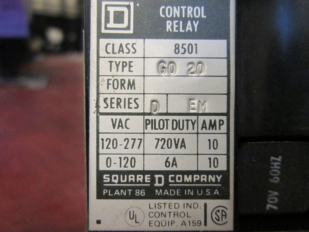 Square D Control Relay 8501G020 10A 0-277V 70V Coil Used